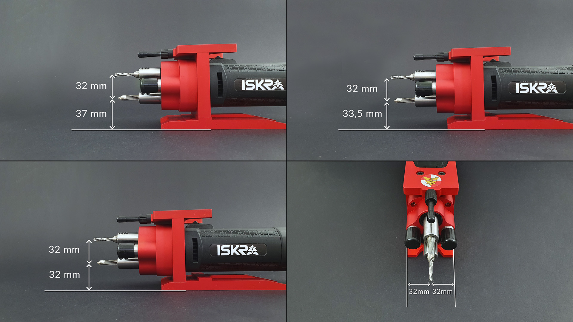 The latest version of the drill features an adjustable (3-position) base, allowing for different drilling heights (measured from the worktop to the first spindle) – specifically: 32 mm, 33.5 mm, and 37 mm.
