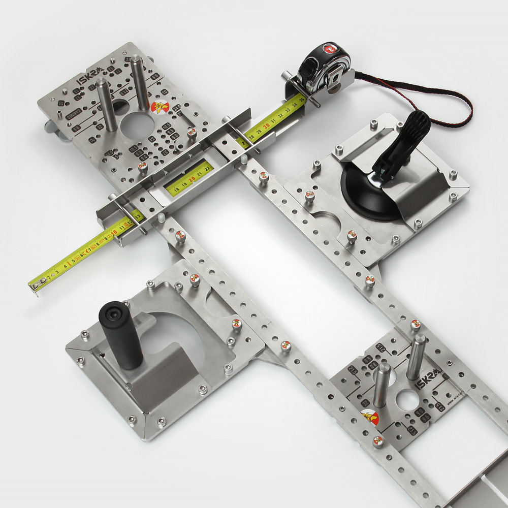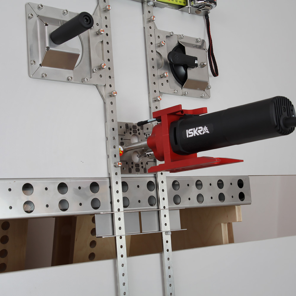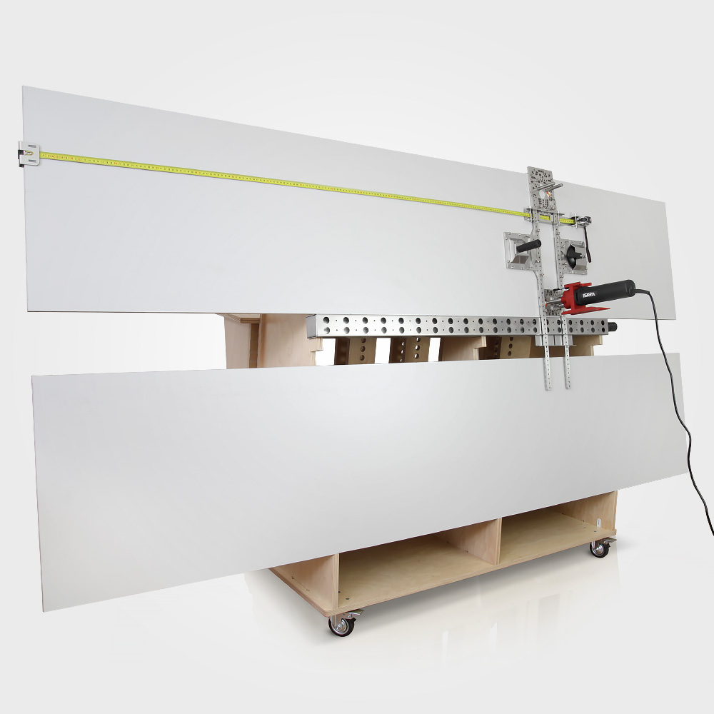 Positioning jig set enabling drilling of holes using both the metric system and the 32mm system on large panels.