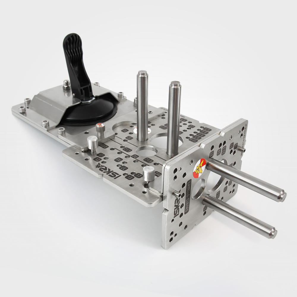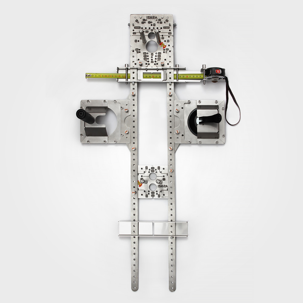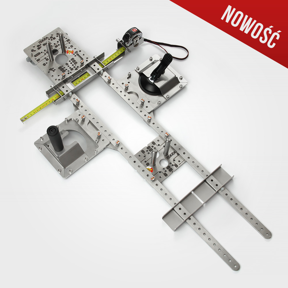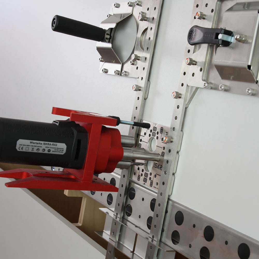 Positioning jig set enabling drilling of holes using both the metric system and the 32mm system on large panels.
